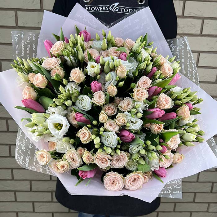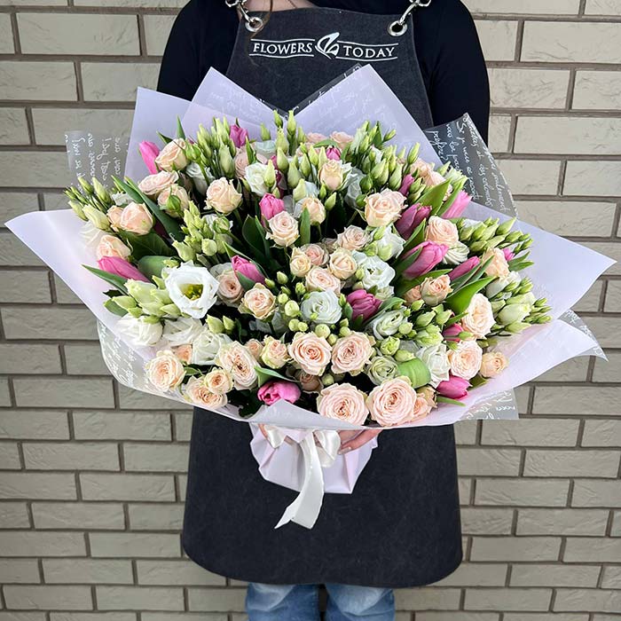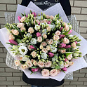 Букет №1053 «Нежный букет тюльпанов, роз и эустом»