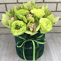 Букет №1212 «Зеленые пионовидные розы с орхидеями в бархатной коробке»