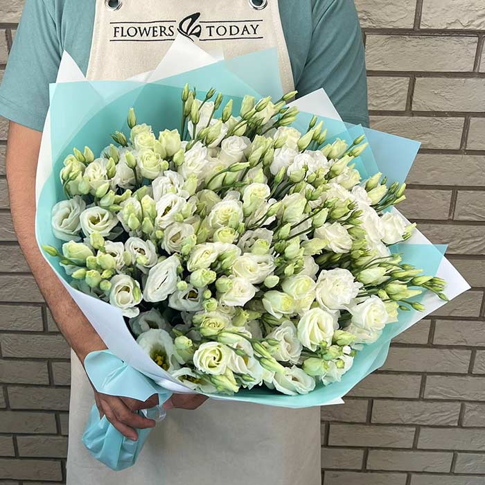 Букет №2644 «Белые эустомы в дизайнерской упаковке»