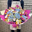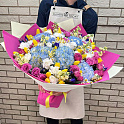 Букет №6987 «Пионовидные розы, тюльпаны, ромашки, гортензии»