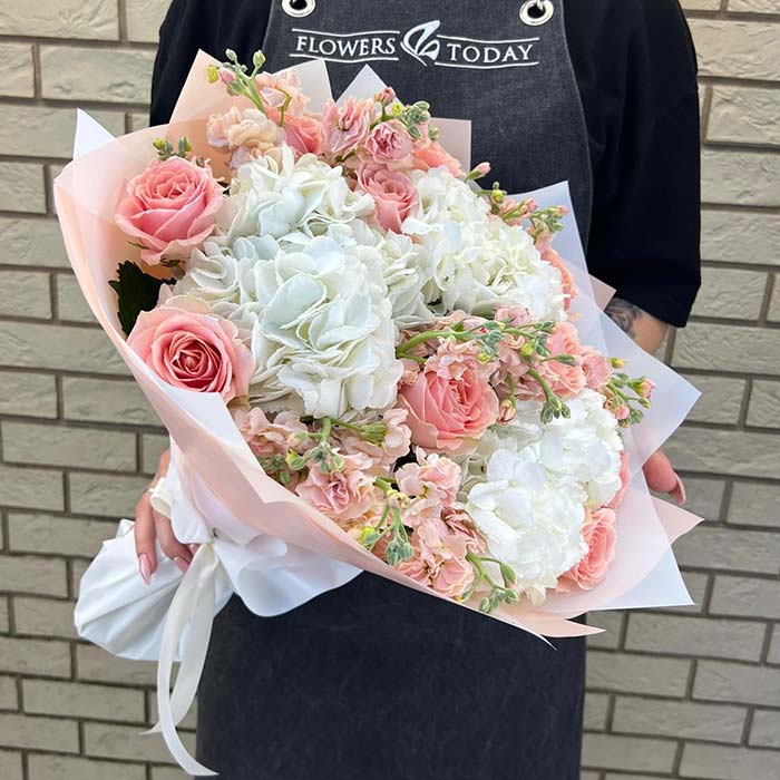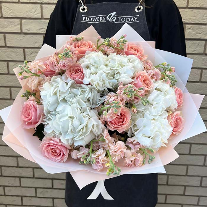 Букет №7462 «Нежные розы, гортензии и маттиола»