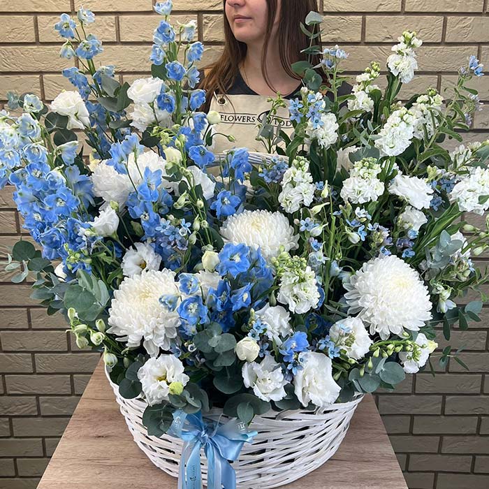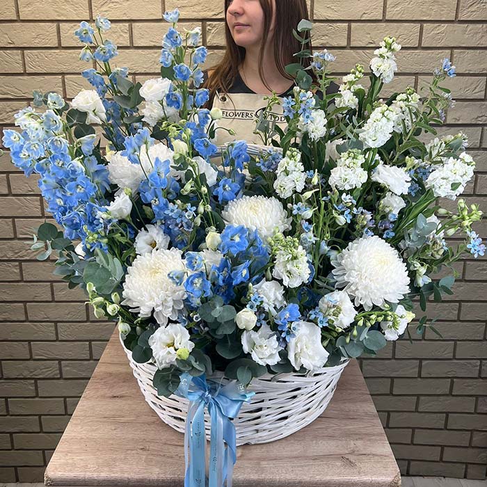 Букет №7517 «Дельфиниумы, маттиолы, хризантемы, эустомы, розы»