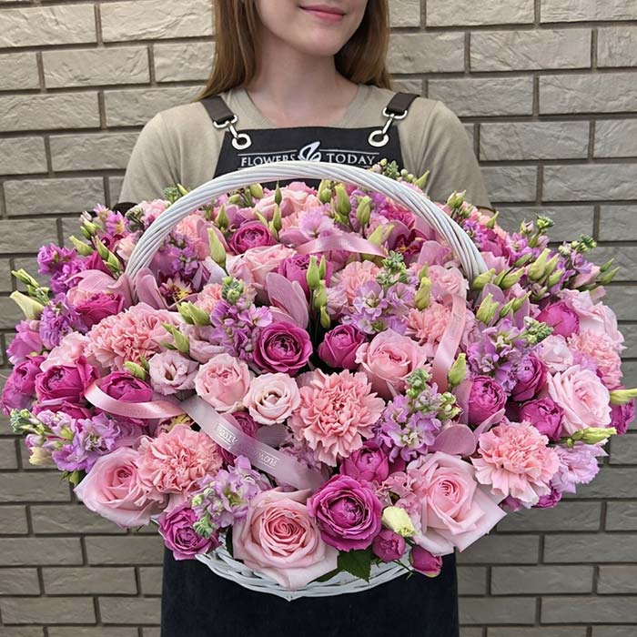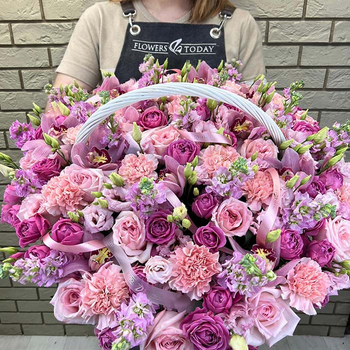 Букет №7563 «Пионовиные розы, эустомы, орхидеи, гвоздики»
