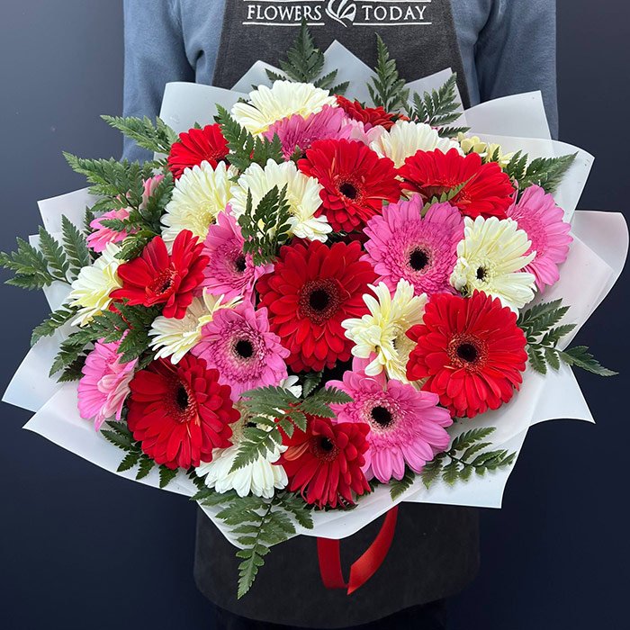 «Герберы розовые, красные и белые»