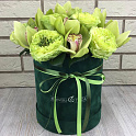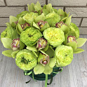 Букет №1212 «Зеленые пионовидные розы с орхидеями в бархатной коробке»