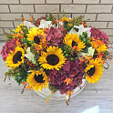 Букет №1366 «Подсолнухи и экзотика в коробке»