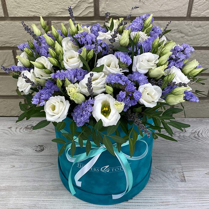 Букет №1474 «Эустома и статица в бархатной коробке»