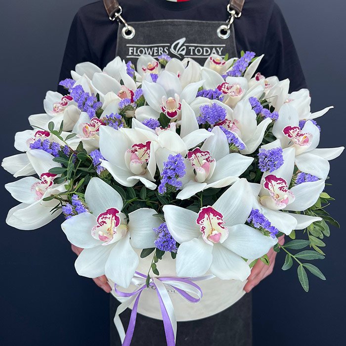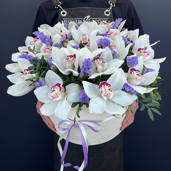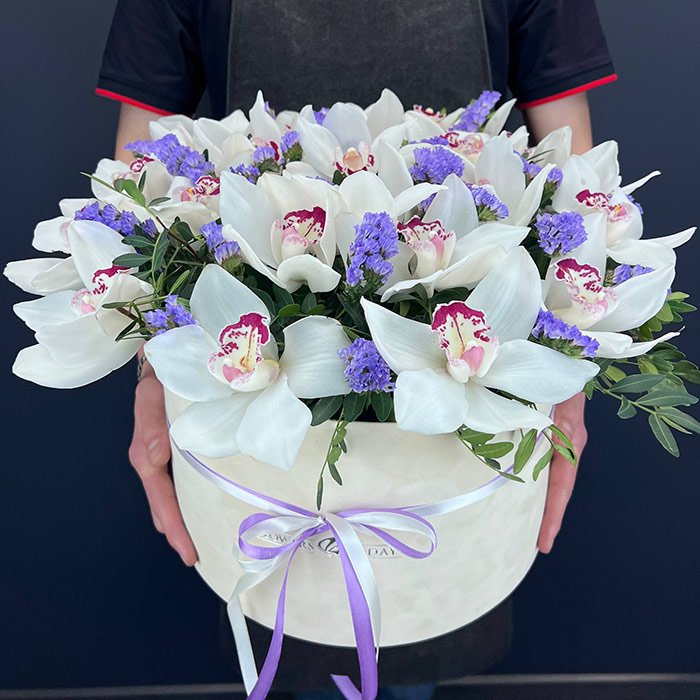 Букет №1964 «Орхидеи, статица и зелень в коробке»