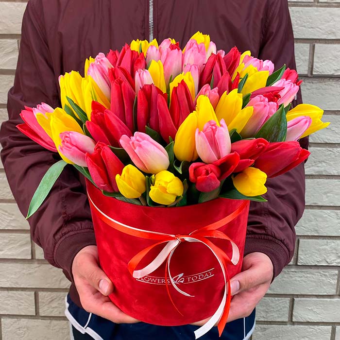 Букет №1975 «59 тюльпанов микс в красной коробке»