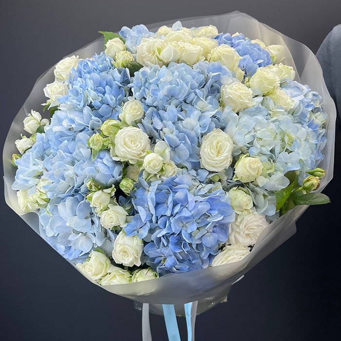 Букет №7601 «Гортензии и белые кустовые розы»