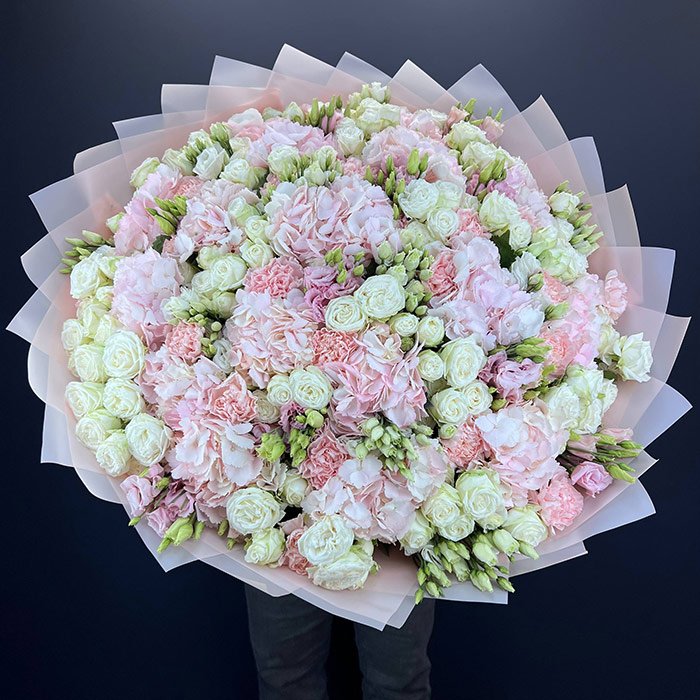 Букет №7607 «Большой букет гортензий, пионовидных роз, гвоздик и эустом»