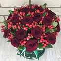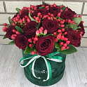 «Красные розы и гиперикум в бархатной коробке»