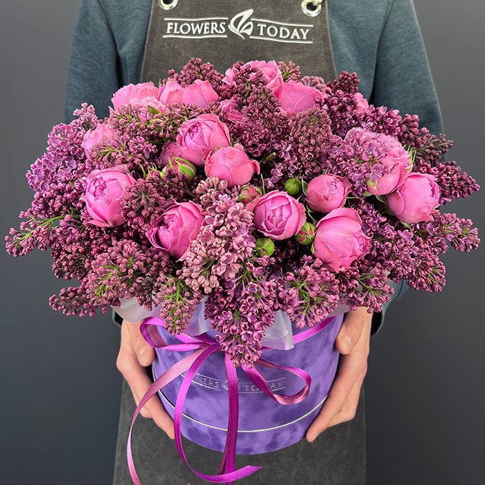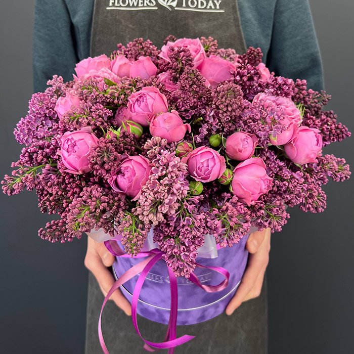 «Сирень и пионовидные розы в коробке»